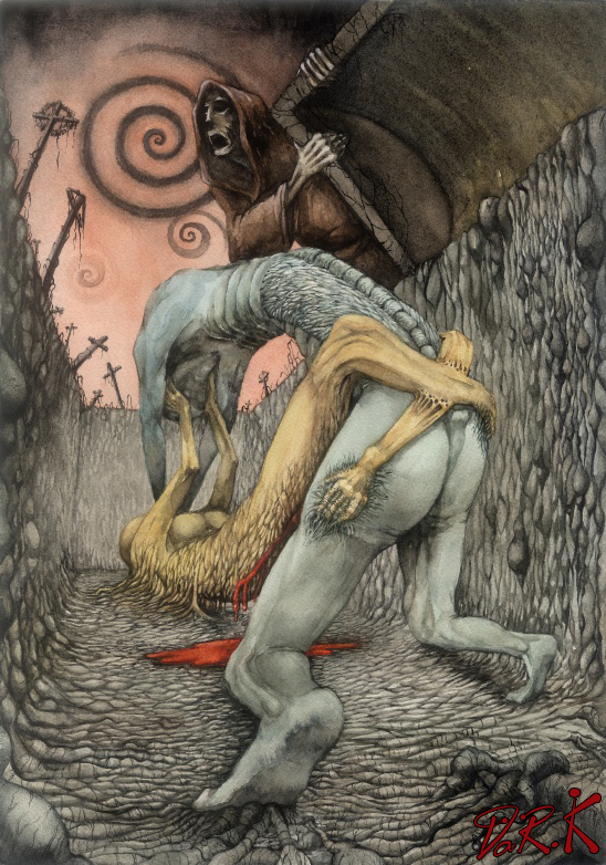젊은이의 부모님과 일가 친척인 듯한 몇몇 사람들이 슬피 울며 이미 시체나 다름없이 누워있는 그에게 마지막 작별을 고하는 모습을