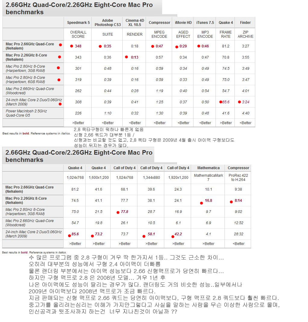 잘 보시면 2008년 첫 출시되 2009년까지 판매된 구형 2.8 옥타 (4코어2개) 는 신형인 2.66 쿼드보다 훨씬 느립니다.