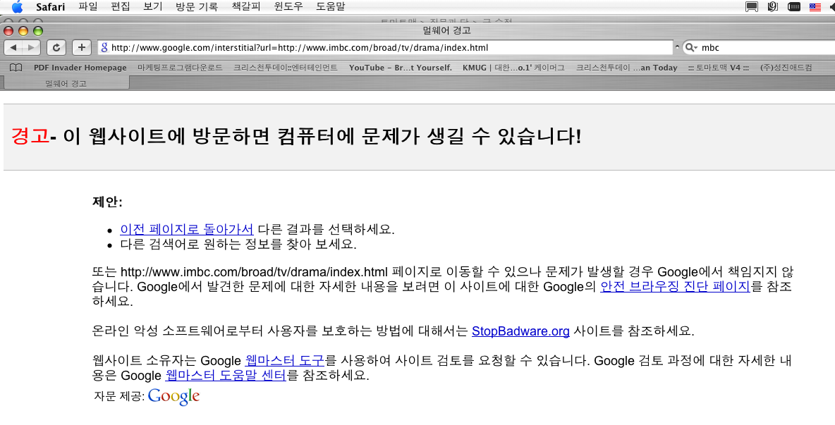 파이어폭스나 사파리로 사이트들어가니 악성코드메세지가 뜨는데...