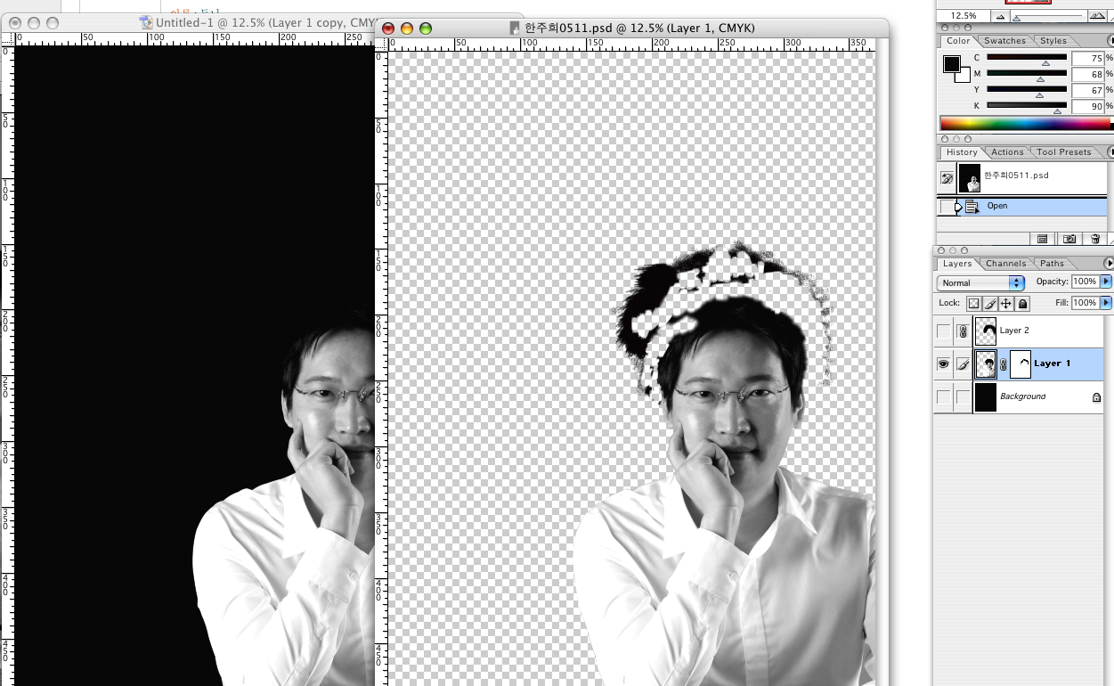 남자의 머리가 검은 바탕색과 자연스럽게 스며들게끔 해야하는데요,