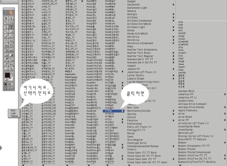 그러면 일러스트 서체목록이 옆으로 펼쳐지지 않고. 그냥 길게 나오게 되어서 볼드체등을 선택하실수 있습니다.