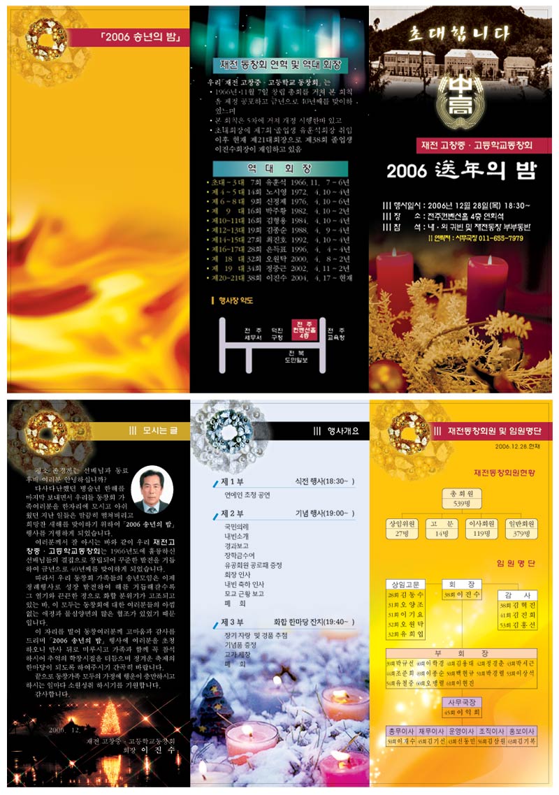 통일감 없어보인다고 생각됩니다. 더불어 여러가지 bar가 자기자리를 못찾는듯 싶습니다. 메인과 서브를 생각해야할 것 같습니다. 그리고 서체가 너무 많이 사용되어서 무엇부터 읽을지 고민됩니다. 표지의 2006이 제목서체와 어울리지 않습니다. 약도는 더 정리해야할 것 같고 배경은 좀 걷어내도 될 것 같습니다. simple과 over의 선을 잘 생각해봐야 할 작품입니다. (너는 얼마나 잘하겠냐고 욕하실지도 모르겠지만 ;; )