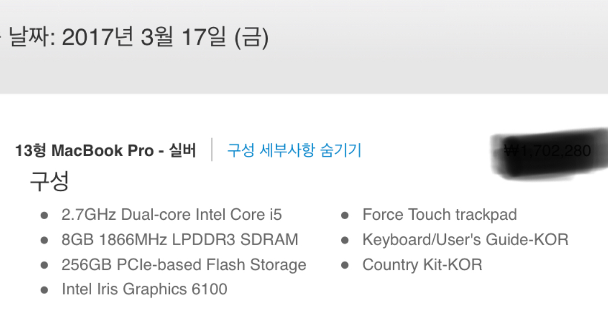 2017년 3월 17일에 구입한 맥북 프로 13인치 입니다.