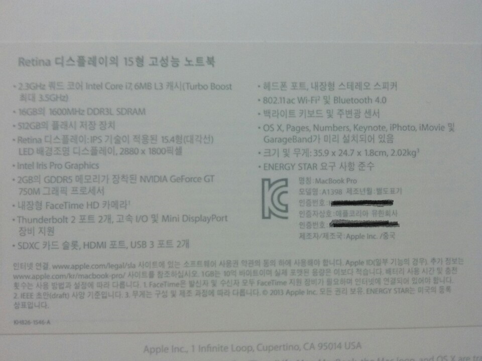 1. 물품명 :2014 맥북프로 15' 레티나 고급형 ME294KH/A
